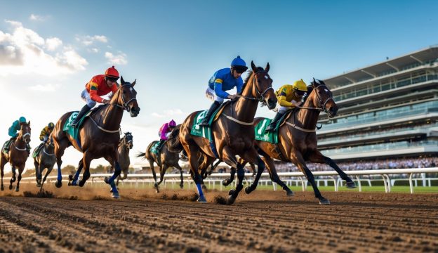 Beberapa kuda pacu dengan joki berwarna-warni berlari cepat di lintasan balap, dengan tribun penonton yang ramai di latar belakang.