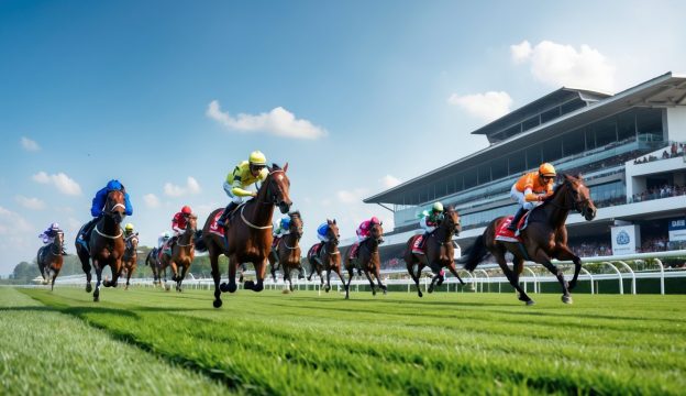 Lomba balap kuda dengan beberapa joki menunggangi kuda melaju kencang di lintasan hijau dengan tribun penonton di latar belakang.